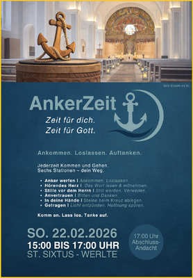 Die AnkerZeit ist eine "Offene Kirche" die am Sonntag, 22. Februar 2026 zwischen 15:00 bis 17:00 Uhr besucht werden kann. Wir enden mit einer Abschlussandacht um 17:00 Uhr. Wir freuen uns darauf, diese Zeit mit dir zu teilen - komm einfach so, wie du bist, und lass dich tragen!