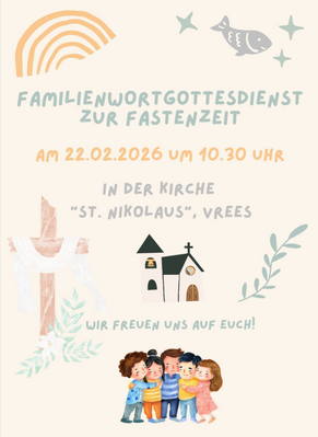 Herzliche Einladung zum Familienwortgottesdienst zur Fastenzeit am 22.2. um 10:30 Uhr in St. Nikolaus, Vrees.