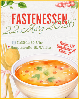 Die KJW lädt ein zum Fastenessen am Sonntag, 22. März im Gemeindezentrum St. Sixtus, Werlte.