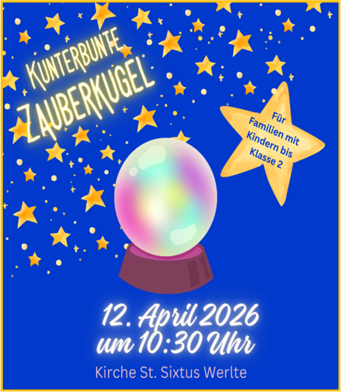 Die "Kunterbunte Zauberkugel" ist eine interaktive Erlebniszeit für Kinder im Kirchenraum - gemeinsam mit ihren Eltern oder gerne auch mit ihren Großeltern. Mit Liedern, Bewegung, kleinen Entdeckungen und einer geheimnisvollen Zauberkugel begeben wir uns auf eine bunte Reise: Mal entdecken wir einen Schatz, mal erleben wir eine Geschichte, mal lernen wir ein Ritual kennen. Die Kinder dürfen mitmachen, staunen, sich bewegen und die Kirche spielerisch kennenlernen. Wichtig: Die "Kunterbunte Zauberkugel" ist kein Gottesdienst und keine Andacht, sondern eine kreative, lebendige Mitmach-Aktion für Kinder und ihre Begleitpersonen.